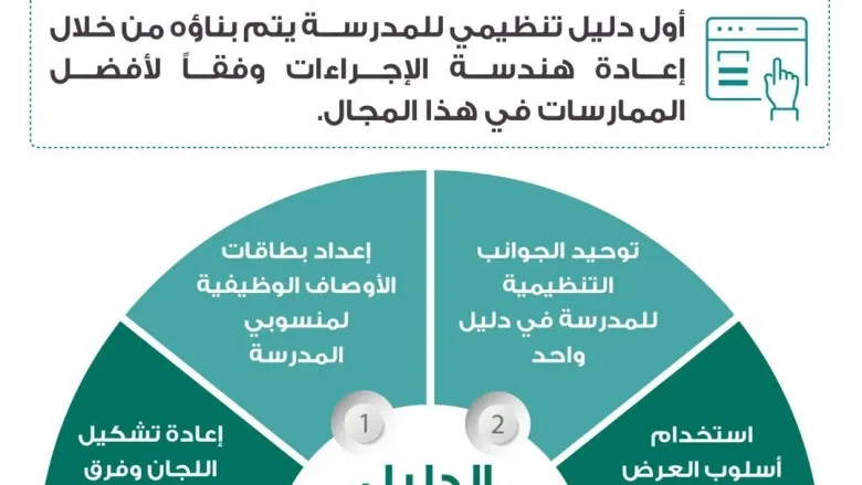 تمت الإشارة إلى الدليل التنظيمي لمدارس التعليم العام (1443) والذي تمت الإشارة إليه. تصدر وزارة التربية والتعليم السعودية كل عام دليلاً تنظيميًا لتنظيم الإجراءات والمهام المختلفة الموكلة إلى جميع الموظفين العاملين في مدارس التعليم العام .