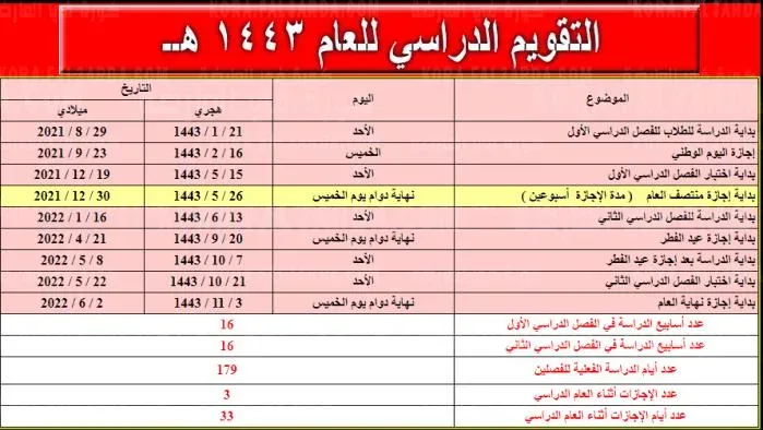 جدول اجازه المدارس ١٤٤٣ في السعودية 2022