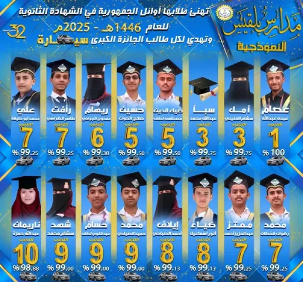 وفي خطوة غير مسبوقة، قامت مدارس بلقيس النموذجية في اليمن بتكريم طلابها المتفوقين من أوائل الجمهورية في امتحانات الثانوية العامة لعام 2025م  عبر تقديم 16 سيارة فاخرة لهم كمكافأة على تفوقهم الأكاديمي.