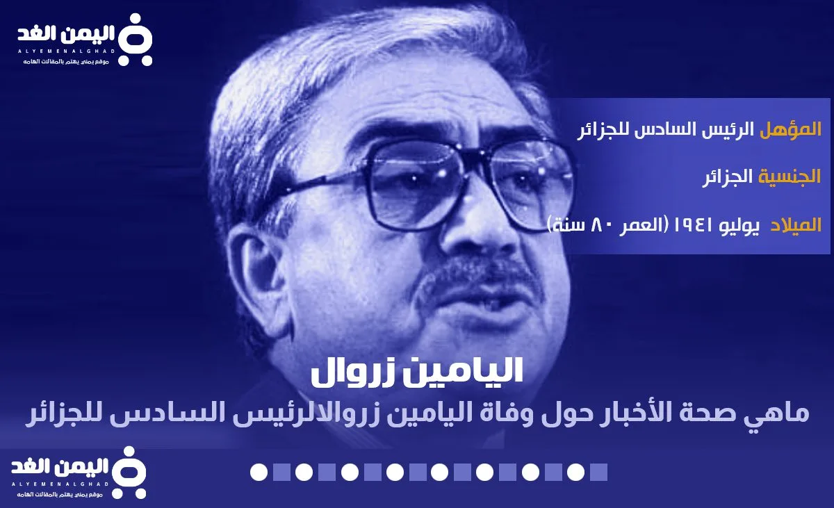 ماهي صحة خبر وكذلك حقيقة وفاة اليامين زروال الرئيس السادس للجزائر حيث تصدر البحث في الجزائر عبر مواقع السوشيال ميديا تويتر وكذلك فيس بوك خبر موت اليمين زروال وهو الرئيس السادس للجزائر عن عمر ناهز 80 عام , وهنا من خلال مقالنا على اليمن الغد سوف نوضح صحة تلك الأخبار.